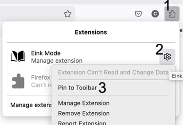 If the default keyboard shortcut (⌘+Shift+1 for Mac and Ctrl+Shift+1 for Windows ) to activate the Eink mode conflicts with other extension or that of browser. You can change the shortcut by the puzzle icon.